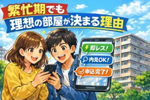 1月〜3月、9月〜10月は不動産業界の繁忙期。「良い物件がすぐ埋まる」「不動産屋の返信が遅い」「内見が取れない」など、部屋探しでストレスを感じる人が一気に増える時期です。 そんな中で重要になるのが、繁...